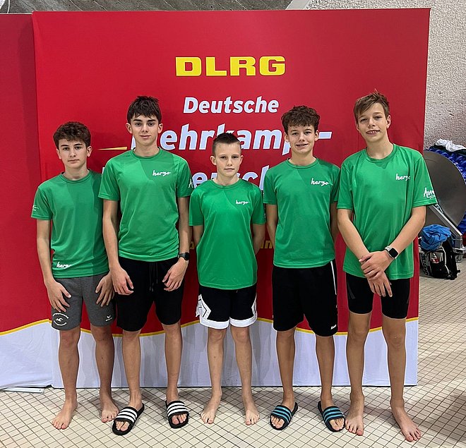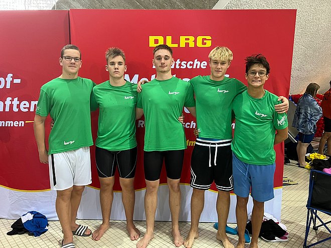 Auch in den Mannschaftswettbewerben am Sonntag zeigte die DLRG Herzogenaurach ihre Stärke. Die männliche Mannschaft der Altersklasse 13/14 (Emilio Orestig- Orzco, Lucas Schaefer, Leon Florian, Lasse Sundberg, Noah Meyerhöfer) sicherte sich den ersten Platz, ebenso wie die Teams der Altersklassen 17/18 weiblich (Xenia Schröder, Alma Riehle-Mendez, Fiona Baumann, Lene Friedrich) und männlich (Max Kitschke, Anton Rammig, Wilhelm Russ, Paul Steinhagen) und das Team der Altersklasse 240 männlich (Rolf Neubert, Achim Brunner, Peter Stockhammer, Jürgen Zai, Georg Karst).